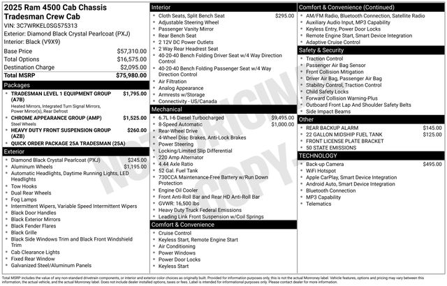 South Fork Chrysler Jeep Dodge Ram is pumped up to offer this fantastic 2025 Ram 4500HD in Diamond Black Crystal Pearlcoat. This vehicle has passed our comprehensive inspection and comes with the following features: 2025 4500HD Tradesman 19.5" x 6.0" Steel Wheels, 22 Gallon Midship Fuel Tank, Black Exterior Mirrors, Bright Front Bumper, Center Hub, Chrome Appearance Group, Chrome Grille Surround, Dual rear wheels, Exterior Mirrors Courtesy Lamps, Exterior Mirrors w/Heating Element, Exterior Mirrors w/Supplemental Signals, Manual Folding Exterior Mirrors, Manual Telescoping Mirrors, Matte Black Mesh Grille w/Chrome, Mirror Power Heat Fold Telescope Black, Mirror Running Lights, Power Adjust Mirrors, Power-Adjustable Convex Aux Mirrors, Quick Order Package 25A Tradesman, Rear Window Defroster, Tradesman Level 1 Equipment Group, Trailer Brake Control, Trailer Light Check.