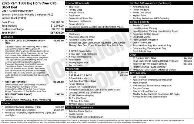 This 2026 Ram 1500 Big Horn/Lone Star is a true standout in its class, blending exceptional performance, advanced technology, and premium comfort features. Experience the difference for yourself by scheduling a test drive at our dealership today. We're confident this truck will exceed your expectations and become the perfect companion for your next adventure. Art is for illustration purposes only. Not responsible for errors or omissions. All vehicle's are plus tax, title, license, official fees, equipment and destination fees.. Price includes: $1000 - 2026 Southwest BC State of Texas Regional Bonus Cash . Exp. 03/02/2026 $3500 - 2026 National Retail Consumer Cash . Exp. 03/02/2026 $750 - 2026 Southwest BC Retail Bonus Cash . Exp. 03/02/2026 Price includes $31,000 of dealer added accessories.