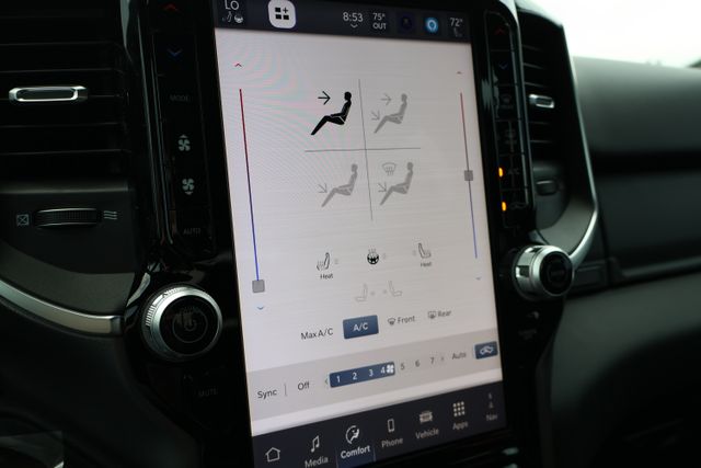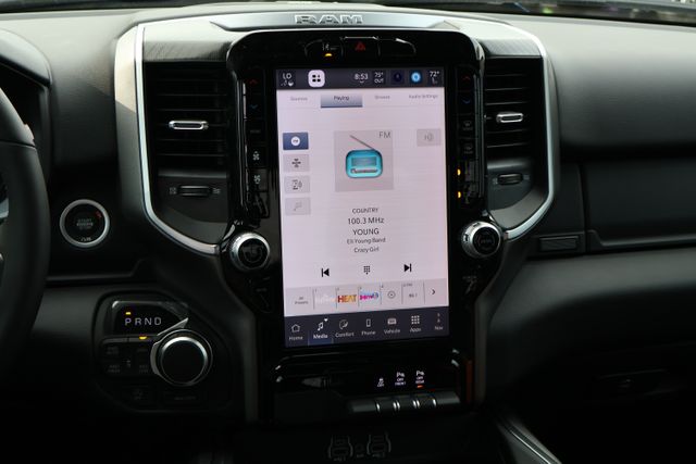 Step inside and you'll be greeted by a spacious and well-appointed interior. The 12-inch touchscreen display puts cutting-edge technology at your fingertips, while the heated steering wheel and front seats ensure your comfort, no matter the weather. With seating for up to five and ample storage space, this Ram 1500 is ready to handle all your hauling and passenger needs.