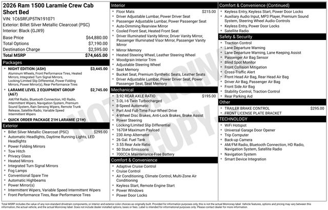 South Fork Chrysler Jeep Dodge Ram is pleased to offer this gorgeous 2026 Ram 1500 in Billet Silver Metallic Clearcoat. This vehicle has passed our comprehensive inspection and comes with the following features: 2026 1500 Laramie 14.4" Touchscreen Display, 4G LTE Wi-Fi Hot Spot, Accent Color Door Handles, Accent Color Premium Power Mirrors, Accent Color Tailgate Handle, Anti-Spin Differential Rear Axle, Auto Power-Folding Mirrors, Auto-Dimming Exterior Driver Mirror, Black Exterior Truck Badging, Black Headlamp Bezels, Black Interior Accents, Black Painted Exterior Mirrors Caps, Black Tail Lamp Bezels, Body Color Front Bumper, Cluster 12" TFT Color Display, Connectivity - US/Canada, Convex Wide-Angle Exterior Mirror Insert, Exterior Mirrors Approach Lamps, Exterior Mirrors Courtesy Lamps, Front Passenger Interactive Display, GPS Navigation, Grille Surround 3 Black Texture 2 Black, Integrated Center Stack Radio, Laramie Level 2 Equipment Group, Navigation System, Night Edition, Pirelli Brand Tires, Power Tailgate, Proximity Approach/Departure Lamps, Quick Order Package 21H Laramie, Rain Sensitive Windshield Wipers, RAM Grille Badge - Black, SiriusXM Radio Service, Sport Performance Hood, USB Host Flip, Wheels: 22" x 9" Forged Aluminum.