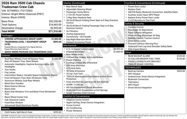 South Fork Chrysler Jeep Dodge Ram is pleased to offer this charming-looking 2026 Ram 3500 in Bright White Clearcoat. This vehicle has passed our comprehensive inspection and comes with the following features: 2026 3500 Tradesman 11.50" Dual Wheels Rear Axle, 22 Gallon Midship Fuel Tank, 6000# Front Axle with Hub Extension, Black Exterior Mirrors, Black Power Heated Fold Telescope Mirrors, Black Wheel Center Hub, Bright Front Bumper, Center Hub, Chrome Appearance Group, Chrome Grille Surround, Dual Rear Wheels, Exterior Mirrors Courtesy Lamps, Exterior Mirrors with Heating Element, Exterior Mirrors with Supplemental Signals, Manual Folding Exterior Mirrors, Matte Black Mesh Grille with Chrome, Mirror Running Lights, Nexen Brand Tires, Power Adjust Mirrors, Power-Adjustable Convex Aux Mirrors, Quick Order Package 25A Tradesman, Rear Window Defroster, Tradesman Level 1 Equipment Group, Trailer Brake Control, Trailer Light Check, Wheels: 17" x 6.0" Black Painted Steel.
