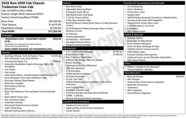 South Fork Chrysler Jeep Dodge Ram is excited to offer this terrific 2026 Ram 3500 in Bright White Clearcoat. This vehicle has passed our comprehensive inspection and comes with the following features: 2026 3500 Tradesman Black Exterior Mirrors, Black Power Heated Fold Telescope Mirrors, Exterior Mirrors Courtesy Lamps, Exterior Mirrors with Heating Element, Exterior Mirrors with Supplemental Signals, Manual Folding Exterior Mirrors, Mirror Running Lights, Power Adjust Mirrors, Power-Adjustable Convex Aux Mirrors, Quick Order Package 25A Tradesman, Rear Window Defroster, Tradesman Level 1 Equipment Group, Trailer Brake Control, Trailer Light Check.